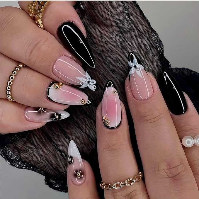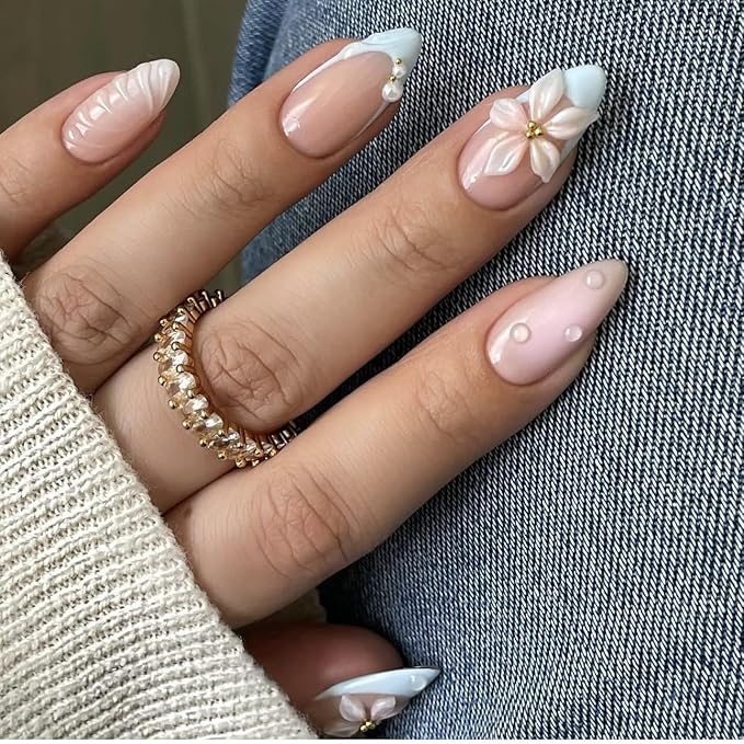 Almond medium French fake nails with flower accents blend classic structure with soft detailing. The floral element adds charm without overpowering the design. This style feels elegant, feminine, and well-balanced. The French base keeps the look polished and timeless. Perfect for refined occasions with subtle personality. The overall aesthetic is graceful and modern.