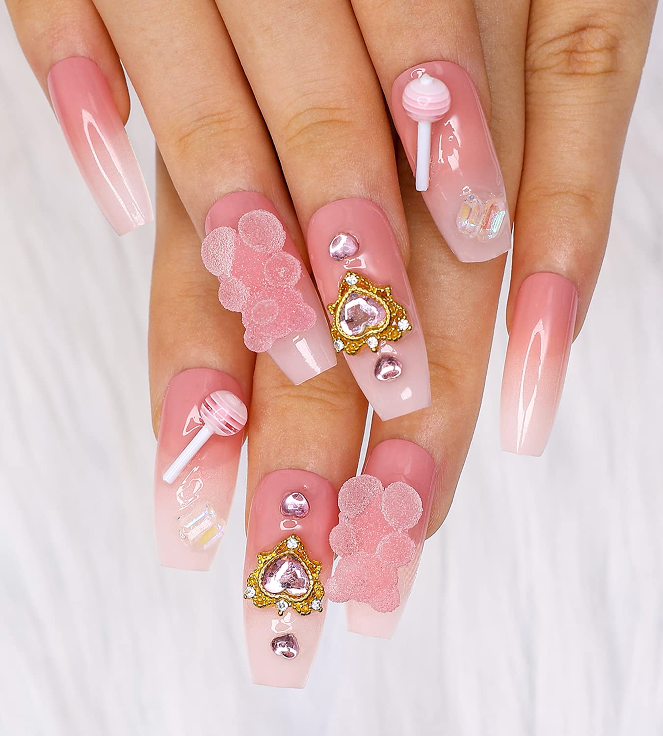 Candy Nails: Pink Coffin Nails with Candy Bear Details