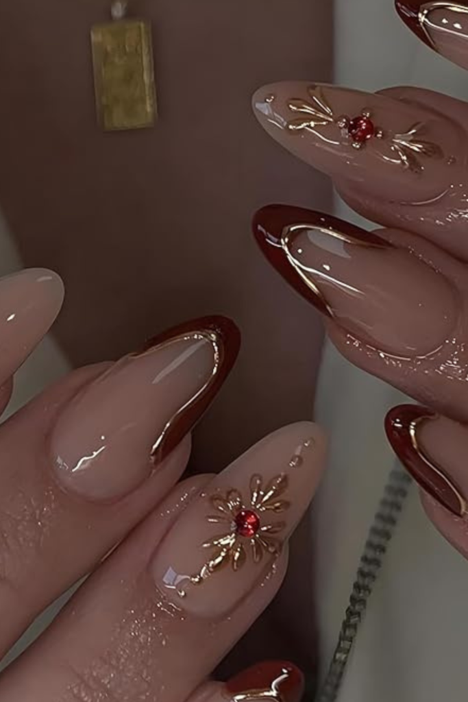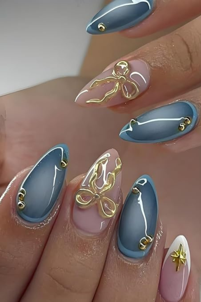These almond-shaped press on nails feature 3D gold bow and star accents that create a festive, luxurious vibe. The metallic elements add dimension and shine without overwhelming the design. The almond shape balances the bold embellishments with elegance. The overall look feels playful yet refined, making it suitable for statement styling. This design captures attention through texture and detail. It’s a polished choice for fashion-forward nail looks.