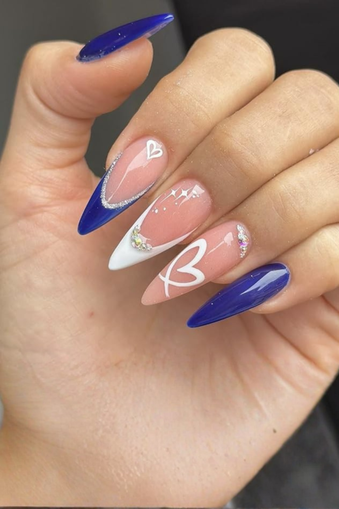 These fake nails refresh the classic French tip with blue tones and decorative heart and diamond accents. The blue tips provide a fresh, modern contrast while maintaining structure. Heart and diamond details add charm without overpowering the design. The overall vibe feels playful yet clean and professionally styled. The look balances youthful energy with polished elegance. This design stands out while remaining wearable and refined.