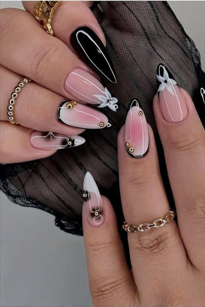 These black and white press on nails present a striking monochrome aesthetic with a clean, graphic feel. The contrast between dark and light tones creates a bold yet refined visual impact. The overall vibe is modern, sharp, and professionally styled. Each nail contributes to a cohesive and intentional look. The simplicity of the color palette enhances its fashion-forward appeal. This design is timeless while still feeling current and stylish.