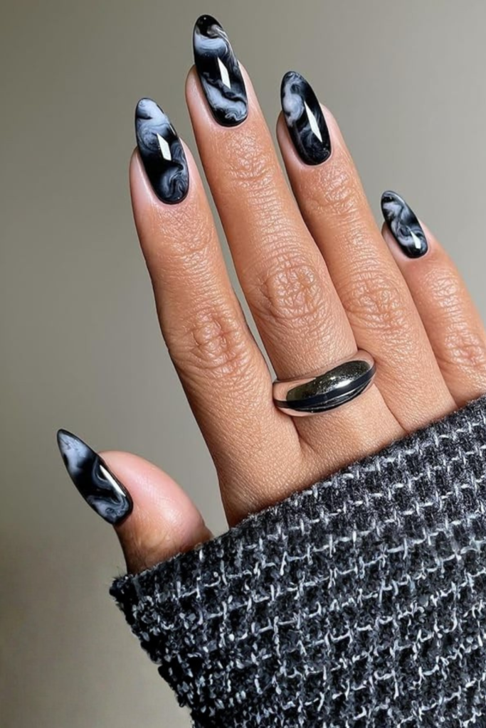 These medium black fake nails stand out with sleek marble detailing that adds visual depth. The marble designs soften the bold black base while maintaining a strong, modern aesthetic. The overall vibe is edgy yet polished, blending artistry with sophistication. Each nail offers subtle variation while remaining cohesive as a set. The medium length keeps the design balanced and wearable. This look is ideal for a fashion-conscious, contemporary style.