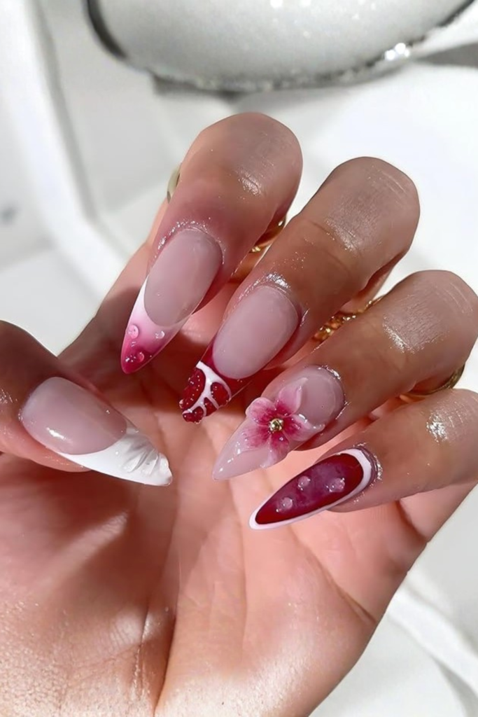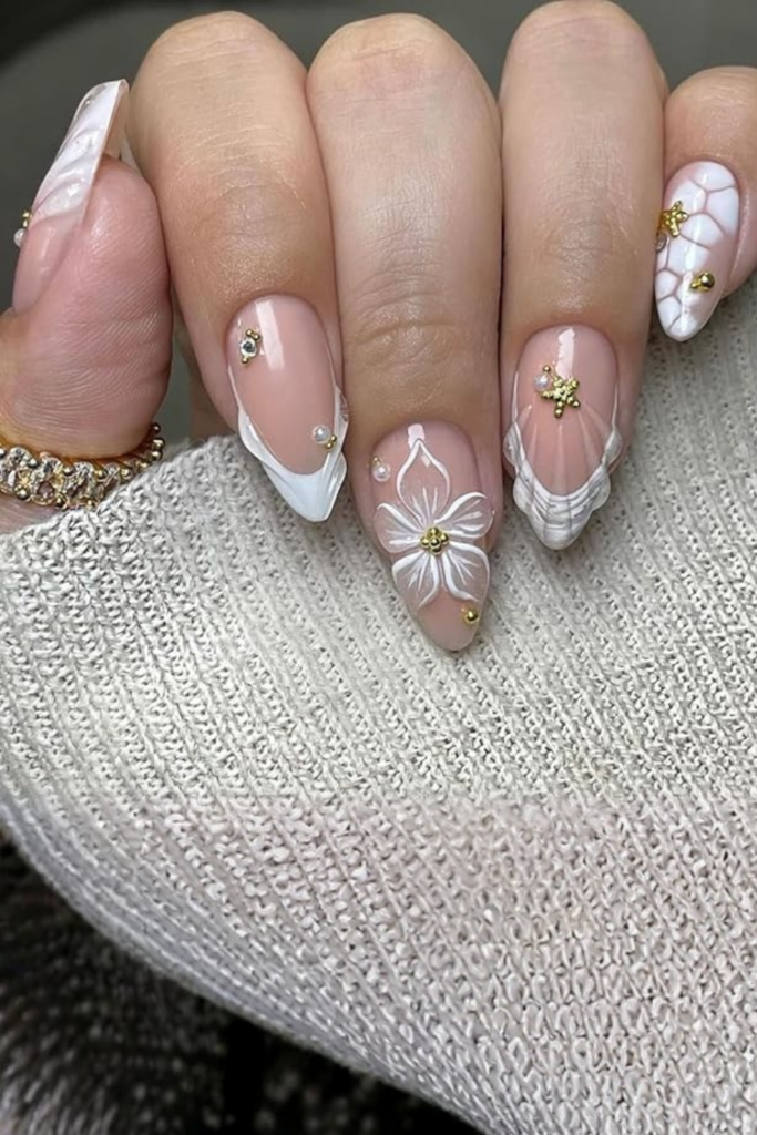 These almond press on nails combine floral designs with pearl accents for a soft, elegant finish. The pearl details introduce subtle dimension and a refined sense of texture. Floral elements contribute to a romantic and graceful overall vibe. The almond shape enhances the delicate aesthetic and keeps the design balanced. The look feels timeless yet contemporary. This style is perfect for those seeking polished sophistication with gentle decorative details.