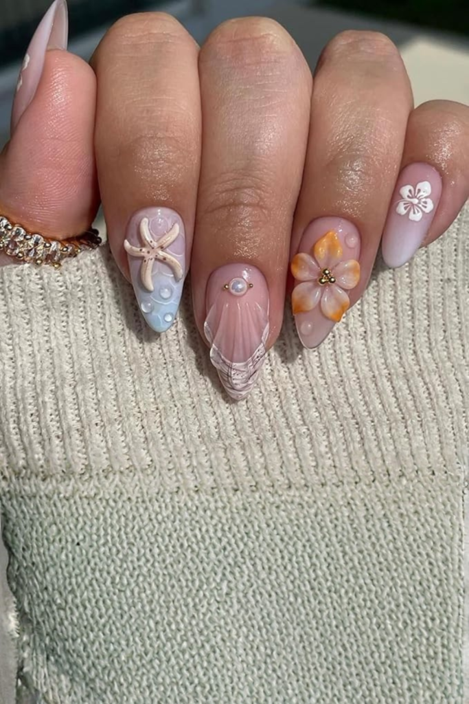 These almond-shaped press on nails feature sculpted 3D floral designs that add artistic depth. The raised flowers introduce texture without overwhelming the look. The overall vibe is elegant and decorative with a polished feel. Design elements are carefully balanced across each nail. The almond silhouette enhances sophistication. This style showcases refined floral nail artistry.