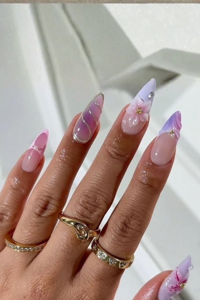 These almond press on nails blend purple and pink shades for a vibrant yet balanced aesthetic. The color combination creates a modern and expressive overall vibe. Each nail transitions smoothly between tones, adding visual interest. The almond shape softens the bold colors for a refined finish. The look feels stylish and contemporary. This design stands out while maintaining elegance.