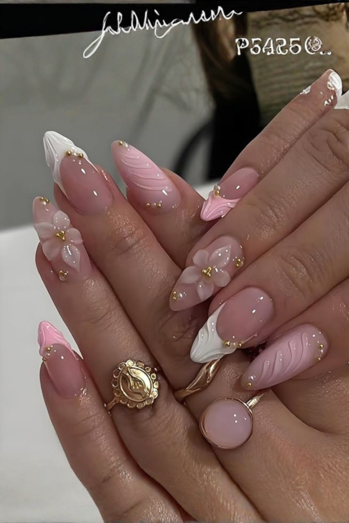 These almond-shaped press on nails feature soft pink tones enhanced by 3D detailing. The dimensional elements add texture while maintaining a cohesive look. The overall vibe is feminine, modern, and polished. Pink hues keep the design elegant rather than playful. The almond shape enhances the refined silhouette. This style delivers subtle impact with a fashion-forward finish.