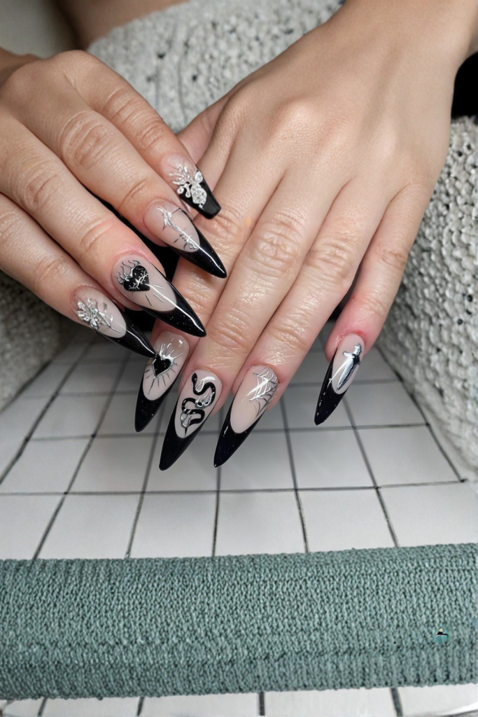 These press on nails reinterpret the classic French tip with bold black detailing. The dark tips create striking contrast while keeping the overall design clean. The vibe is modern, confident, and fashion-forward. Minimal styling ensures the look remains refined rather than dramatic. Each nail appears sharp and well-defined. This design offers a sophisticated update to a timeless classic.