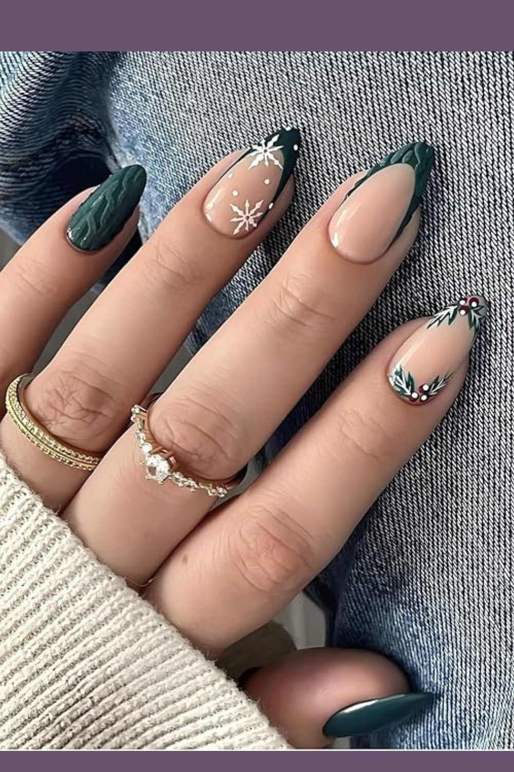 These almond-shaped press on nails capture a festive Christmas-inspired aesthetic with refined styling. The overall vibe is celebratory while remaining elegant and polished. Seasonal elements are presented tastefully without visual excess. The almond shape maintains a graceful silhouette on the hands. This design blends holiday charm with modern sophistication. It’s an ideal choice for festive yet stylish nail looks.