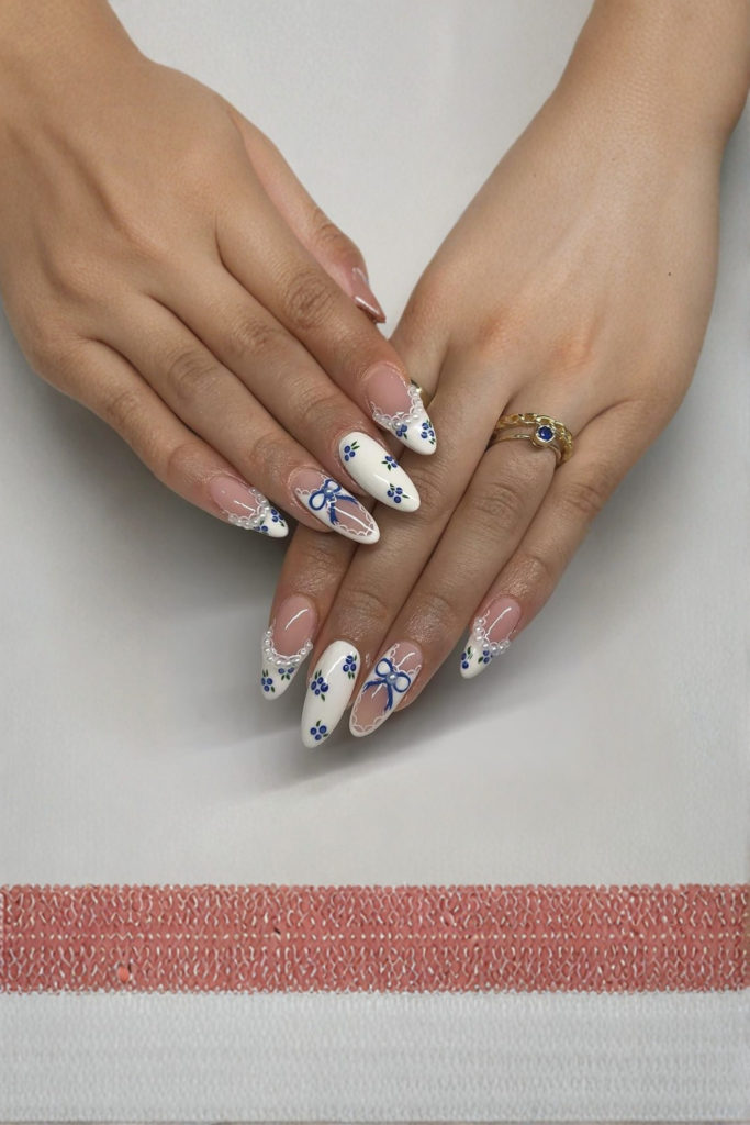 These almond-shaped press on nails blend blue and white hues for a crisp, contemporary look. The color combination creates a calm yet fashion-forward aesthetic. The overall vibe is clean, balanced, and thoughtfully styled. Each nail flows seamlessly into the next for a cohesive appearance. The almond shape adds softness and elegance. This design feels fresh, modern, and polished.