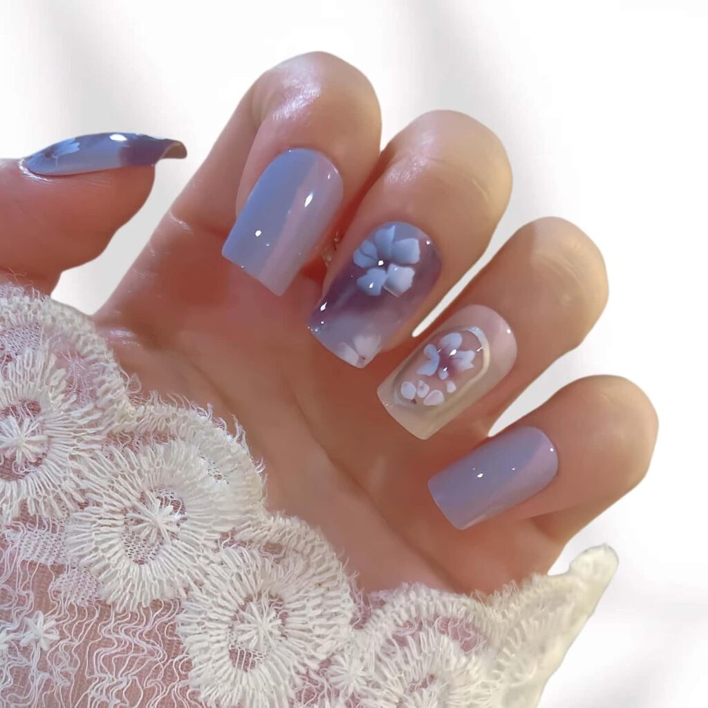 Elegant Flower Squares Nails combine structured nail shapes with delicate floral detailing for a chic, refined look. The square silhouette adds modernity while the floral accents maintain softness and elegance. This design feels sophisticated yet playful, perfect for spring or festive occasions. Its polished finish ensures a professional, fashion-forward appeal. The result is a versatile manicure that balances elegance with contemporary style.