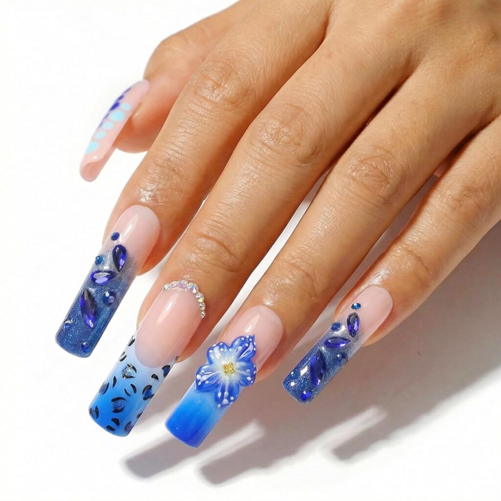 Blue Ombre French nails offer a modern twist on a timeless manicure. The gradient effect creates depth and visual interest while maintaining a clean, polished appearance. Perfect for trendsetters, the design feels fresh, sophisticated, and versatile for any occasion. Its seamless transition of shades adds elegance and a contemporary edge. This manicure balances creativity with wearable style, making it effortlessly chic.