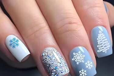 These white glitter swirl glue-on nails combine softness with playful sparkle. Swirl detailing adds movement and visual interest to the design. Glitter accents bring light-catching elegance without excess. This manicure feels cute while remaining refined. It’s a charming option for those who love subtle decorative details. The final look is polished, stylish, and delicately festive.