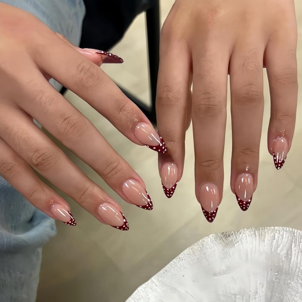 Burgundy red French tips offer depth and richness to the manicure. The deep tone feels elegant and confident. This design delivers a refined alternative to brighter reds. It’s polished, bold, and thoughtfully styled. Suitable for both casual and formal moments. The overall vibe is sophisticated, warm, and modern.