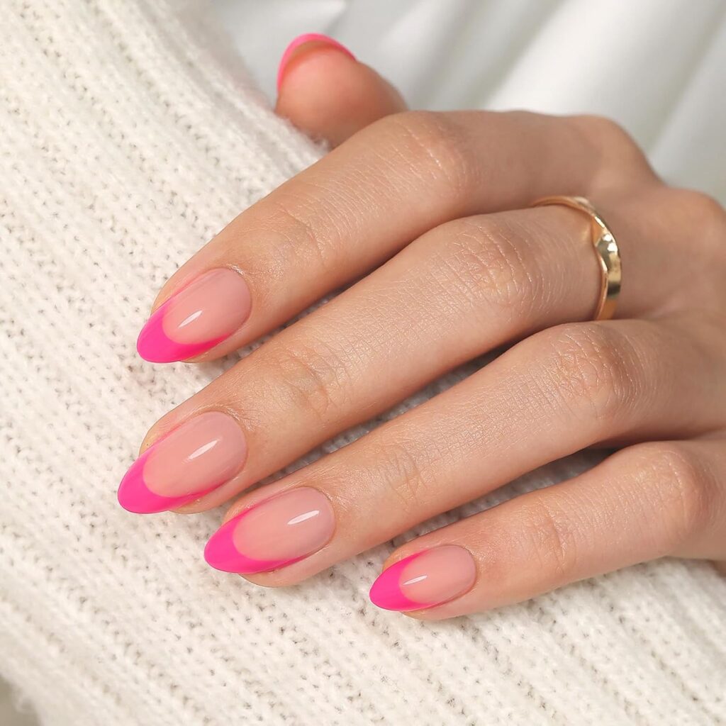 Hot pink French tips create a bold contrast with a polished base. The bright color adds personality while the structured design keeps it refined. This manicure feels confident and playful without appearing overdone. It’s a modern twist on a classic style. Ideal for making a statement with polish. The overall look is vibrant, stylish, and fashion-forward.