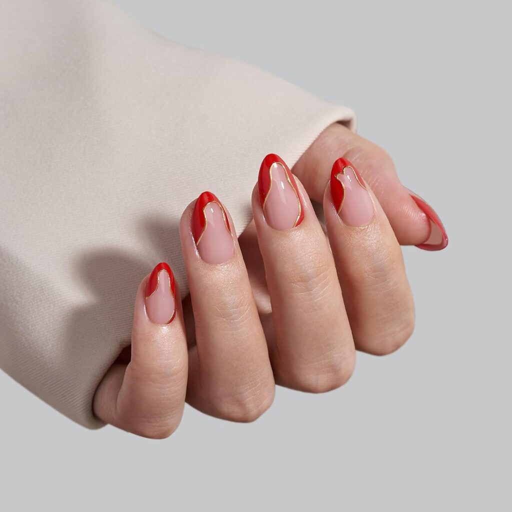 Red French tips with gold foil accents create a striking and luxurious look. The almond shape balances the bold color with elegance. Gold foil details add texture and a refined glow. This design feels festive yet polished. It’s ideal for moments that call for elevated style. The manicure delivers a confident and glamorous finish.