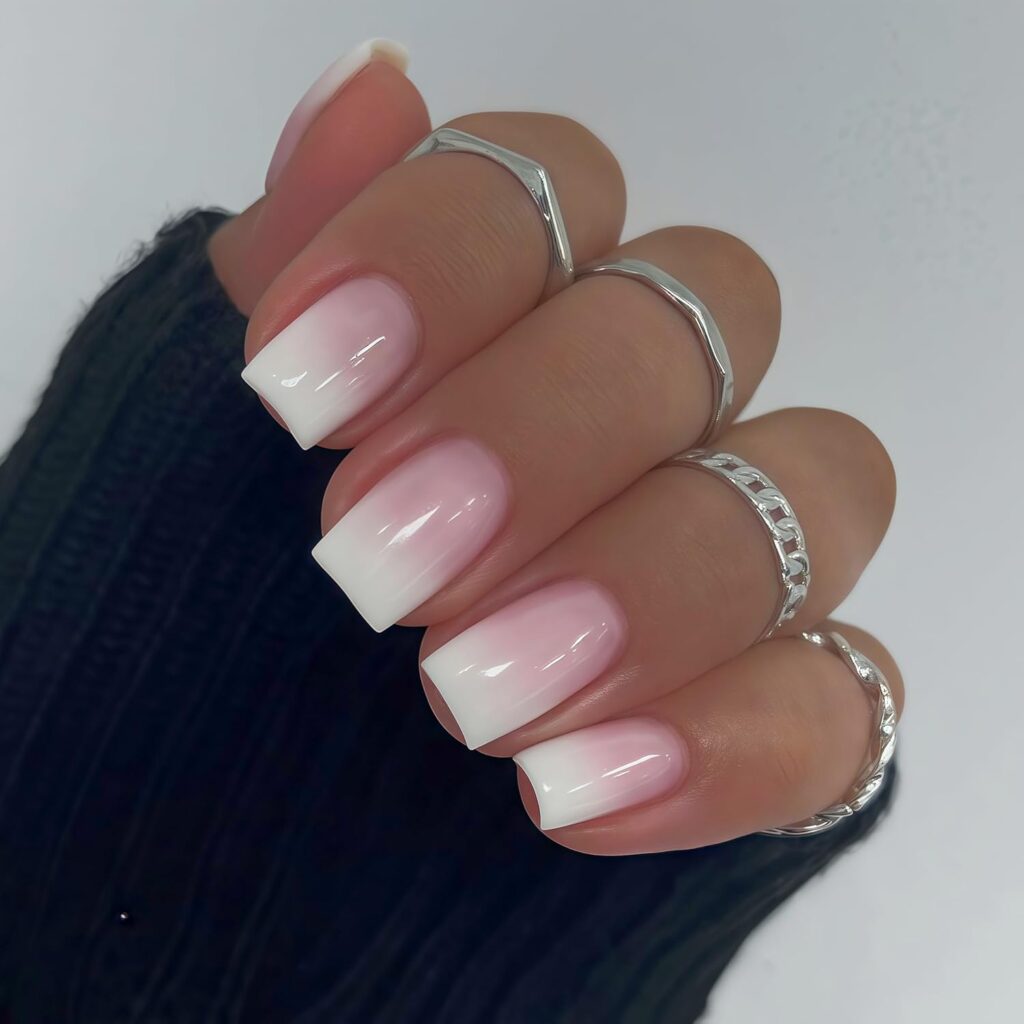 Pink and white ombre tones create a seamless and delicate transition. The square shape adds a clean, contemporary structure. This manicure feels soft yet intentionally styled. It’s a timeless look with a modern finish. Perfect for those who prefer understated elegance. The overall aesthetic is smooth, refined, and feminine.