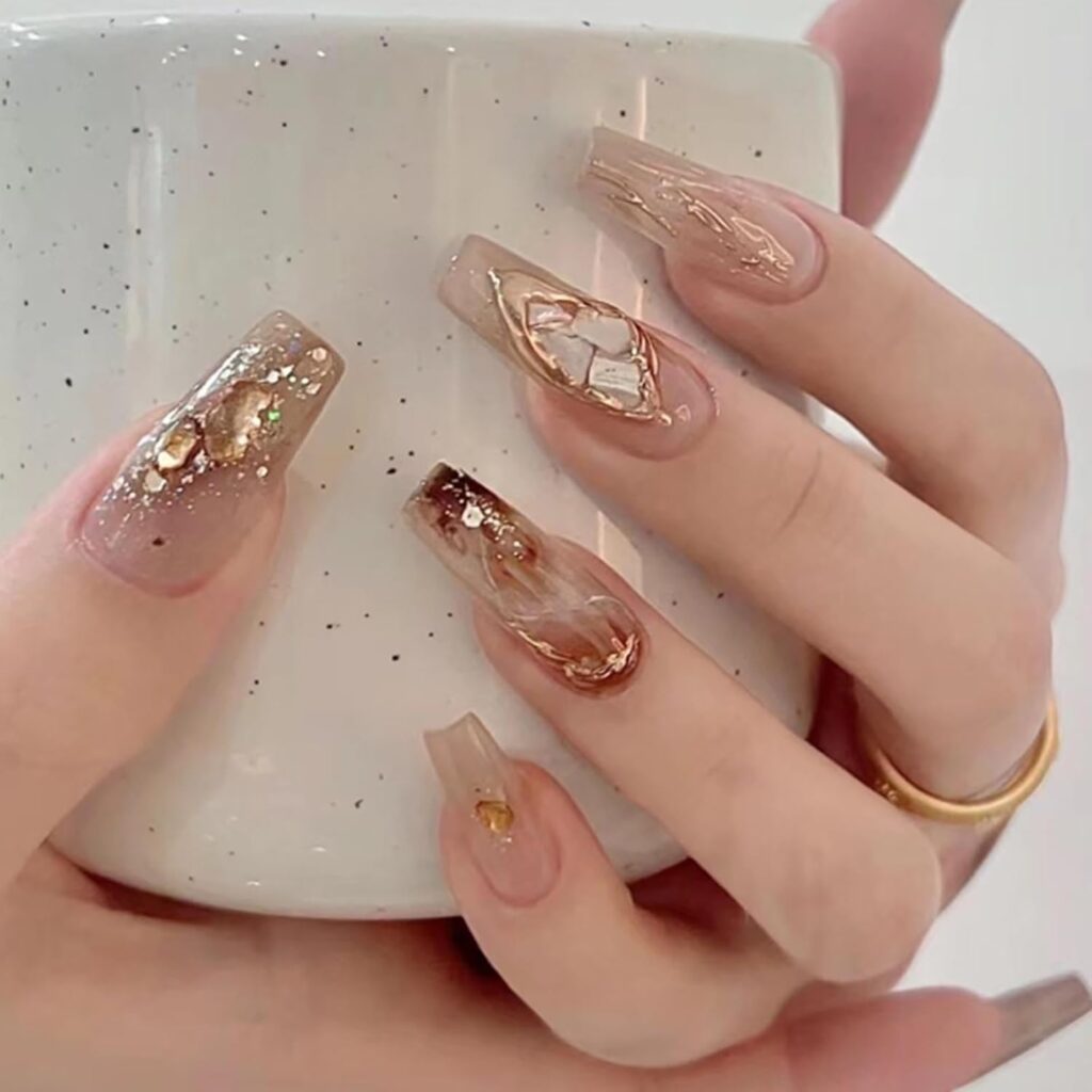 Gold leaf nails look elegant and luxurious. They also feature shimmering gold leaf accents that add style and dimension. Perfect for press-on or acrylic nails, this manicure balances creativity with a polished look. In addition, the metallic shine makes each nail stand out. Gold leaf nails are Instagram-ready and chic. Overall, this manicure is festive, trendy, and refined.