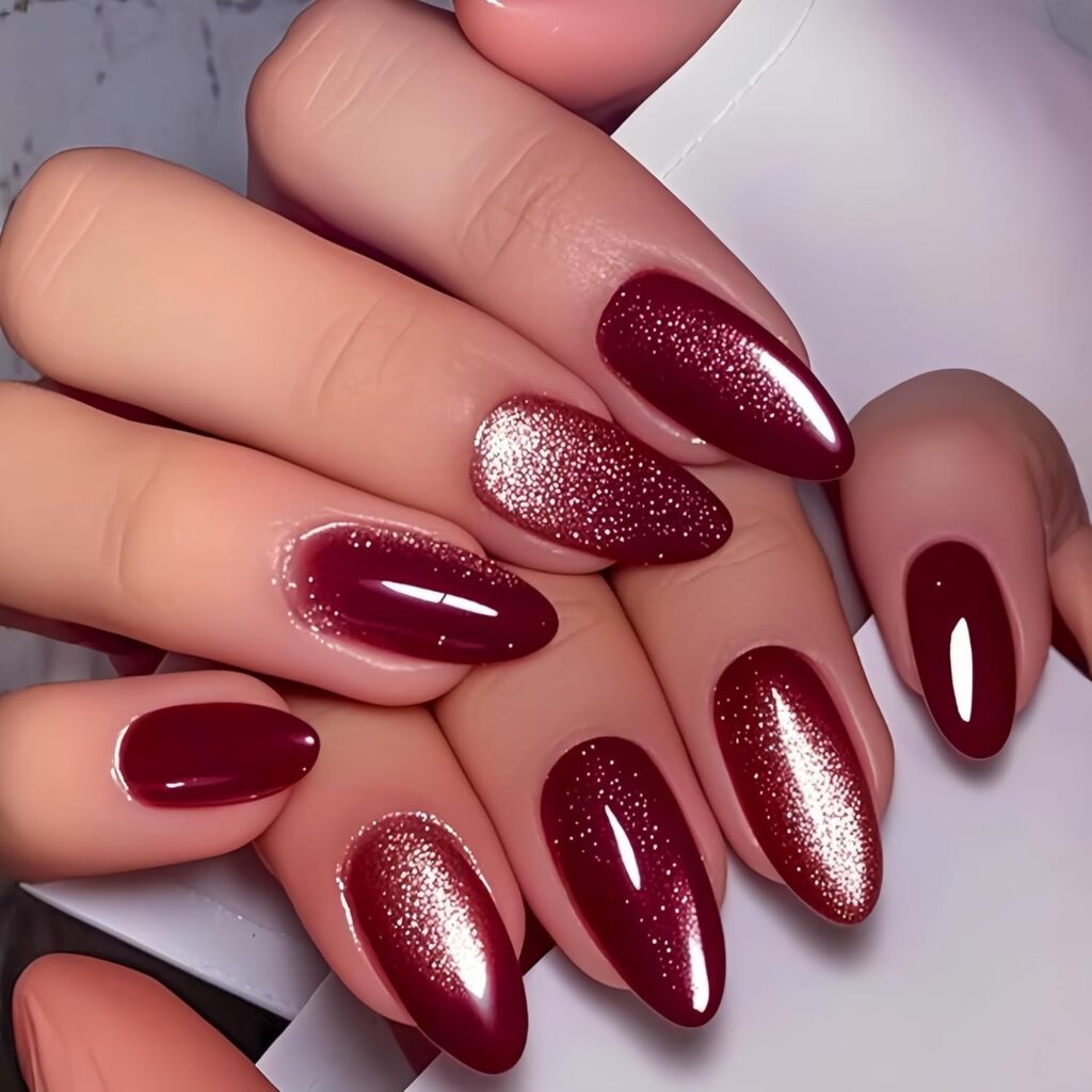 Burgundy cat-eye nails are bold and luxurious. The deep red shade adds richness, while the cat-eye shimmer creates a shiny, reflective finish. They are ideal for press-on, acrylic, or gel nails and work well for parties or evening events. In addition, the look is stylish and polished without being over the top. Burgundy cat-eye nails are perfect for women who want trendy, eye-catching nail art. Overall, this manicure is dramatic and elegant.