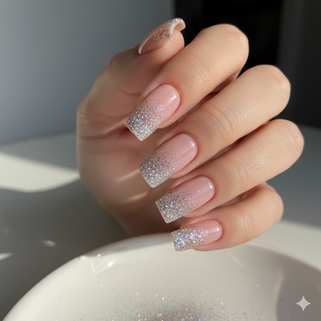 Gradient Glitter Tips feature a seamless ombre effect that sparkles subtly at the tips. This design balances festive glam with minimal elegance, making it perfect for special occasions or a stylish everyday manicure. The glitter adds depth and dimension without overwhelming the nail, resulting in a polished, eye-catching finish.