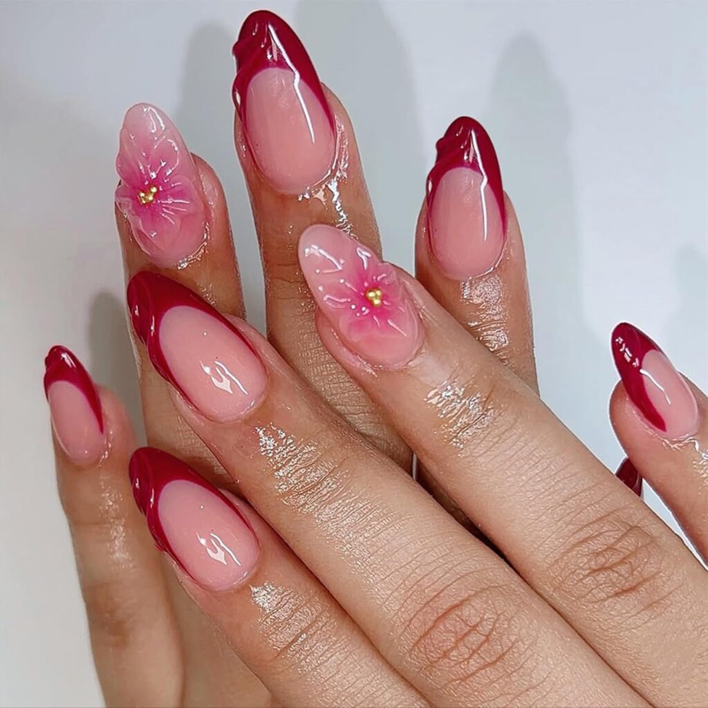 3D Flower Accent Nails feature sculptural floral details that create dimension and sophistication. The medium almond tips provide a polished base, making the flowers the focal point without feeling excessive. This design is ideal for festive occasions or anyone seeking a statement manicure with artistic, fashion-forward appeal.