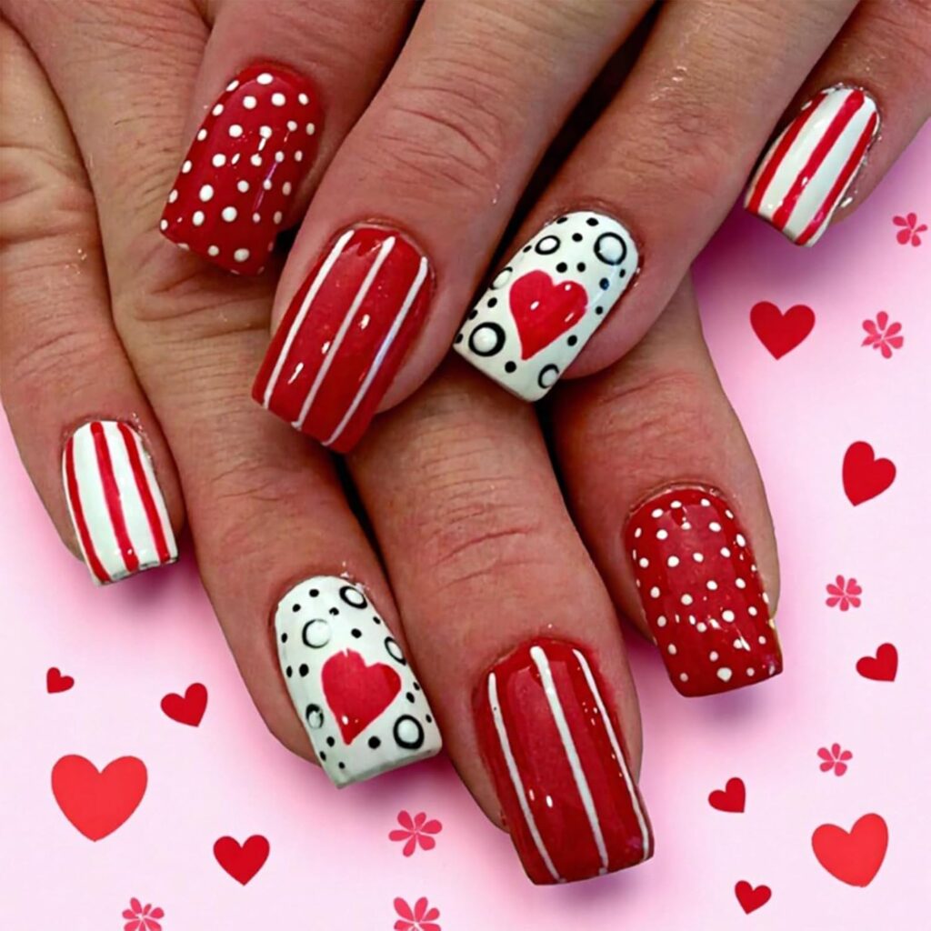 Heart Stripe Nails combine romantic heart motifs with clean black and white stripe accents. The contrast of colors and shapes creates a chic, contemporary look that feels polished and curated. These short almond nails strike a balance between festive charm and minimal elegance. Ideal for Valentine’s Day or anytime you want a stylish, love-inspired manicure.