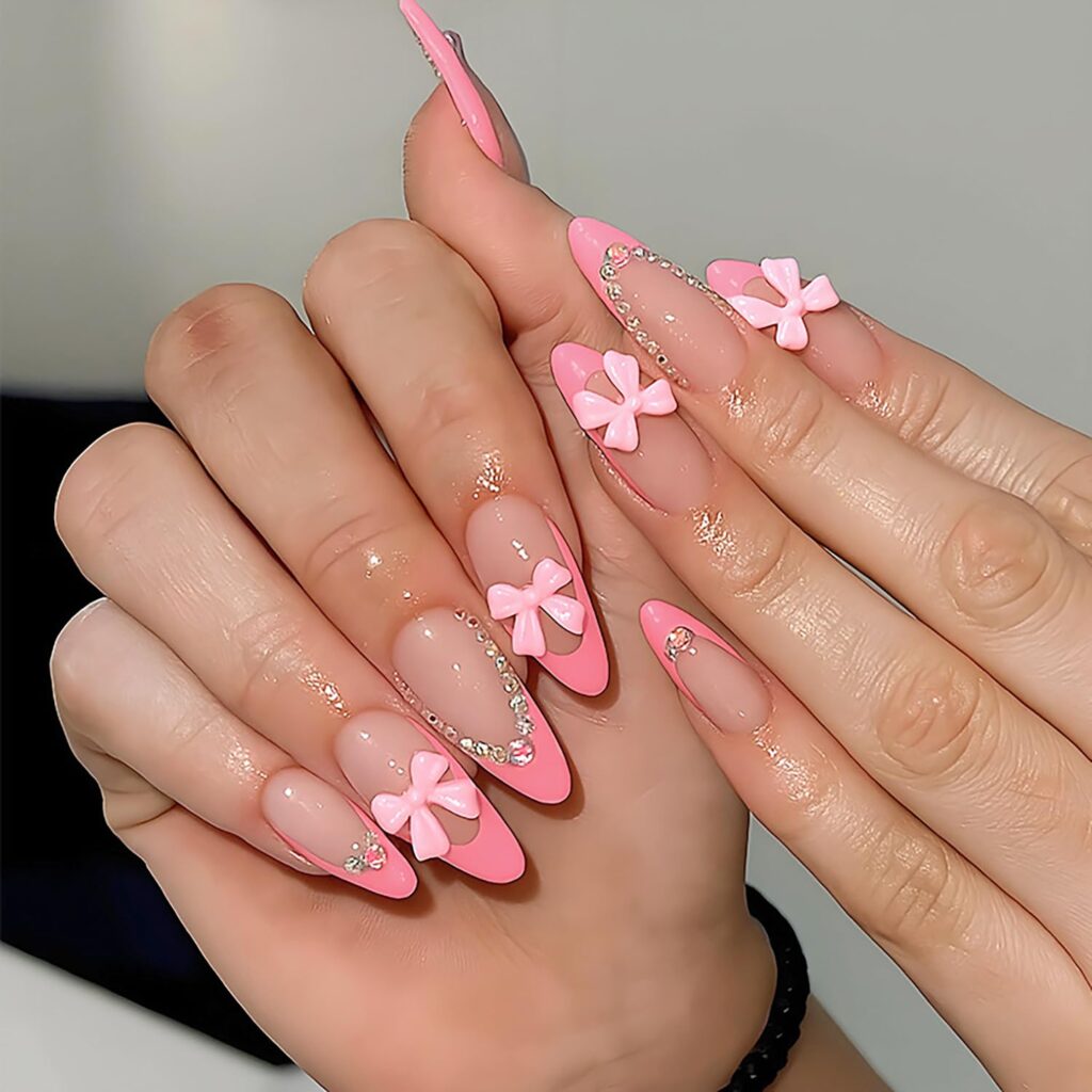 Blush Pink with Bow nails feature a soft pink base complemented by tiny, elegant bow accents. The medium almond shape enhances the delicate and feminine vibe, creating a sophisticated yet charming manicure. Perfect for festive occasions or everyday elegance, this design captures a refined, playful aesthetic without overwhelming the nails.