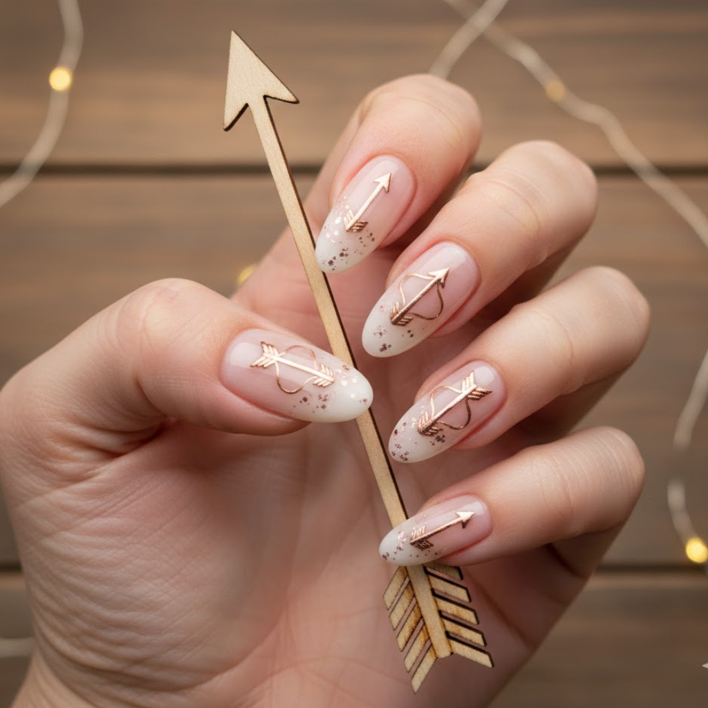 Tiny Cupid Arrows on Nude Base nails combine playful, Valentine-inspired details with a minimalist, neutral background. The subtle design adds a chic and elegant touch without overwhelming the manicure. Perfect for those who enjoy themed nails with a refined and polished look, this style is versatile and wearable.