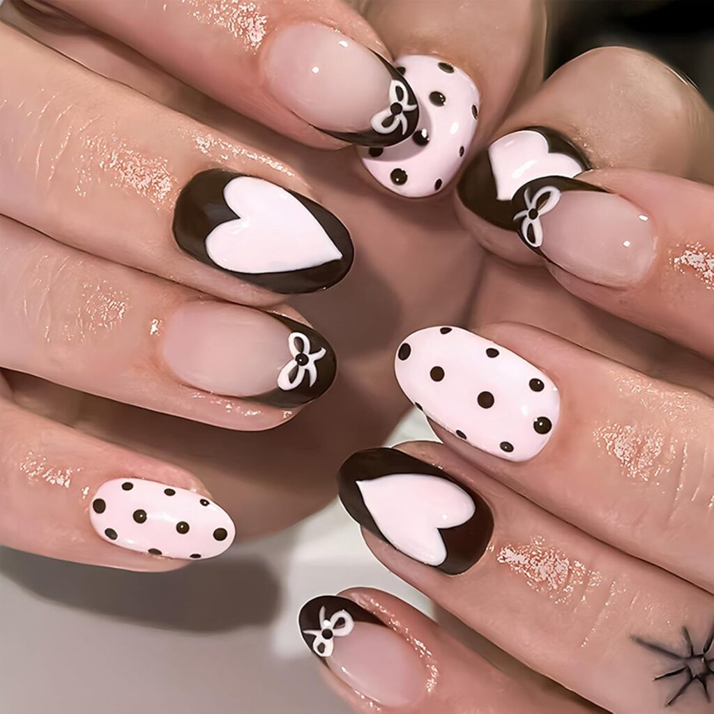 Blush pink tones bring softness and warmth to these oval-shaped nails, creating a flattering and feminine base. Minimal polka dot heart details add a playful yet refined visual element. The oval shape enhances the gentle aesthetic, keeping the manicure elegant and balanced. This design feels lighthearted without losing sophistication. Ideal for those who enjoy subtle patterns with a romantic twist. A chic Valentine look with personality.