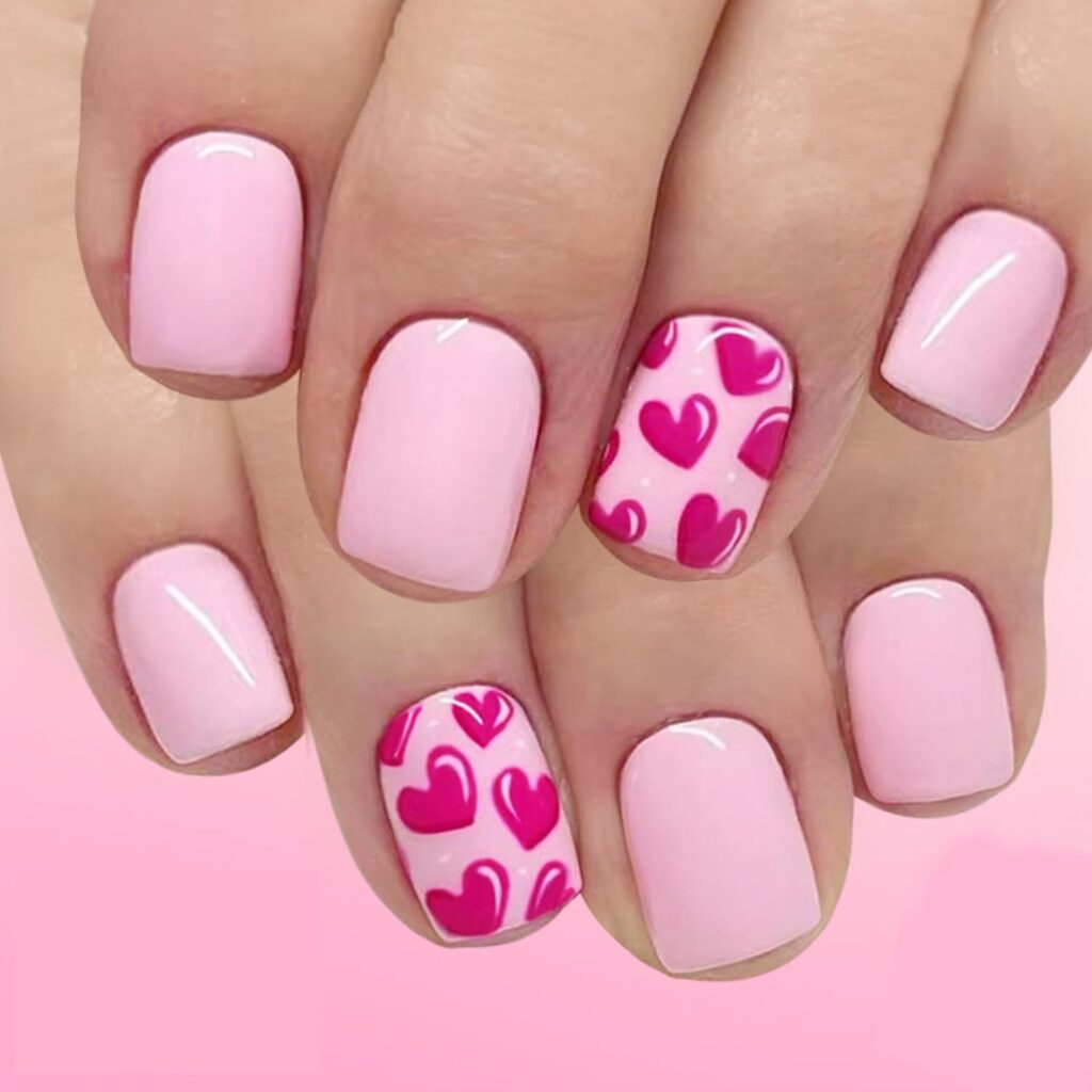 Soft pink tones give these short square nails a fresh, feminine appeal. Glossy heart details add a bold yet polished Valentine accent. The square shape keeps the design clean and contemporary. This manicure feels cheerful while remaining well-structured and elegant. Perfect for those who want festive nails that are still easy to wear. A modern Valentine look with confident charm.