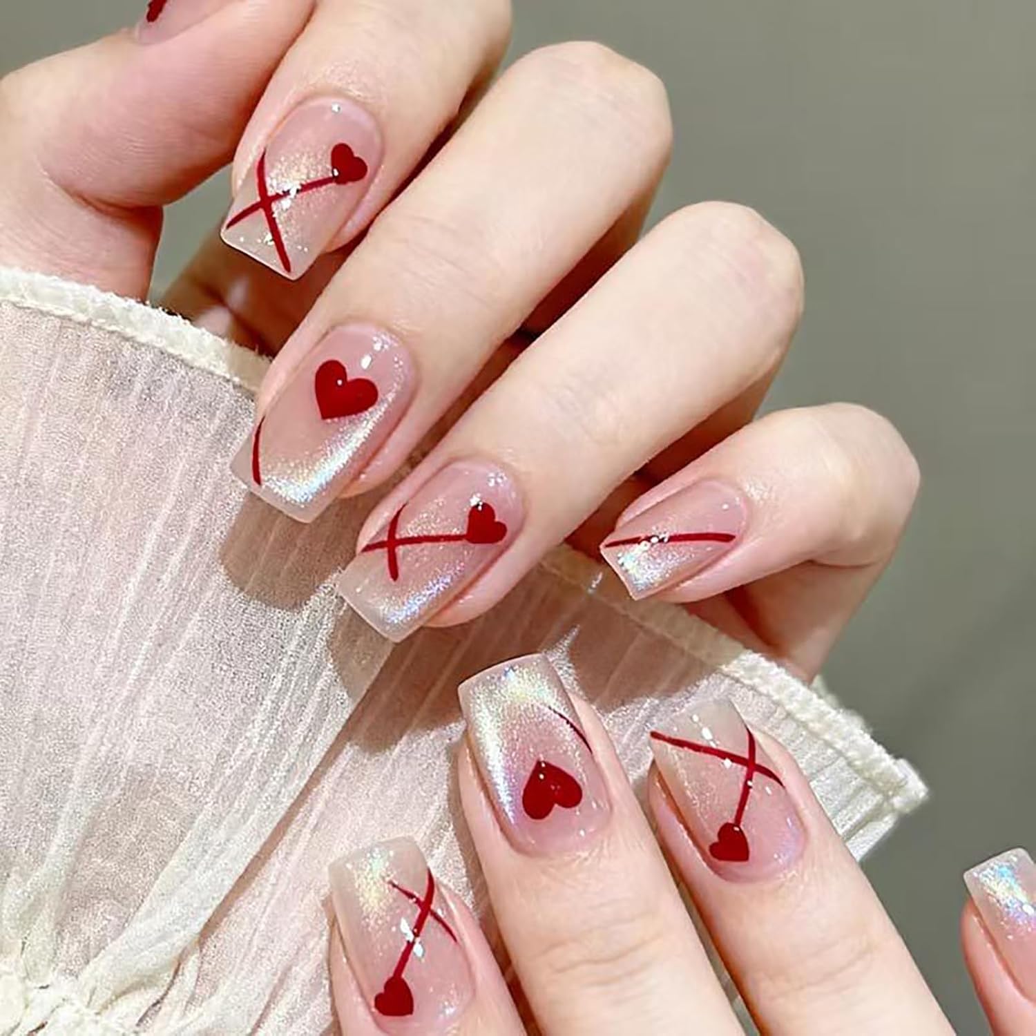 Bold red heart details bring instant Valentine energy to these short square press-on nails. The compact length keeps the design practical and chic, while the square shape adds structure and balance. Glossy finishes enhance the color payoff, making the hearts stand out with confidence. This manicure feels playful yet controlled, striking a balance between festive charm and everyday wearability. Ideal for quick styling with high visual impact, it offers a polished statement without excess. A perfect choice for a modern Valentine look.