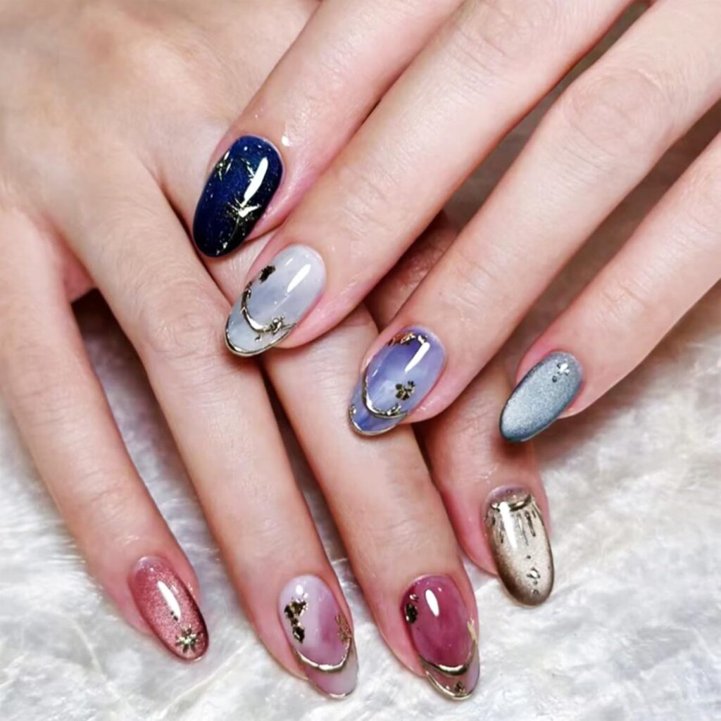 Color-Shifting Glow Nails deliver a modern, eye-catching look that feels dynamic and futuristic. The changing tones create depth and movement, giving the manicure a luminous, elevated finish. This design feels bold yet refined, making it perfect for statement moments without losing elegance. It carries a high-fashion vibe that stands out under different lighting. Ideal for those who love nails that feel innovative and trend-driven. A striking choice for a polished glow-up.