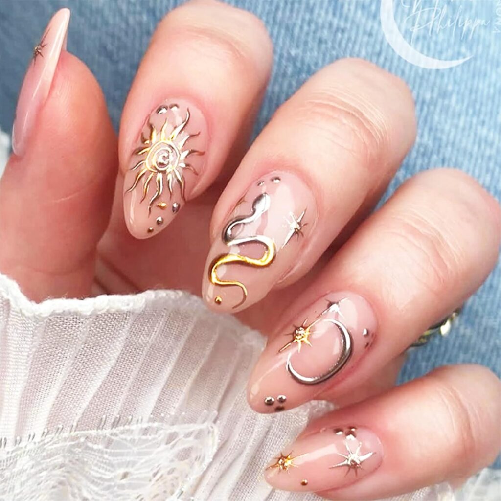 Gold Sun Gel Nails offer a radiant look with a refined metallic touch. The gold accents bring warmth and sophistication to the design. This style feels luxurious yet wearable, ideal for special occasions. It captures light beautifully, adding subtle drama. The overall vibe is elegant and confident. A standout choice for a polished manicure.
