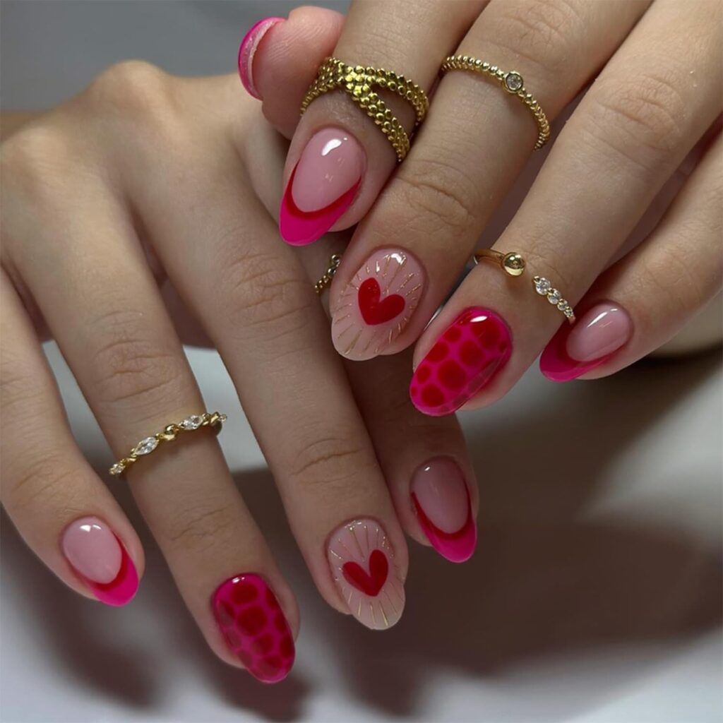 Gold Heart Almond Nails offer a luxe take on Valentine nail art. The almond shape keeps the look elegant, while gold accents add sophistication. This design feels glamorous yet refined. It’s perfect for special occasions or elevated everyday wear. The gold details bring warmth and shine. A stylish blend of romance and luxury.
