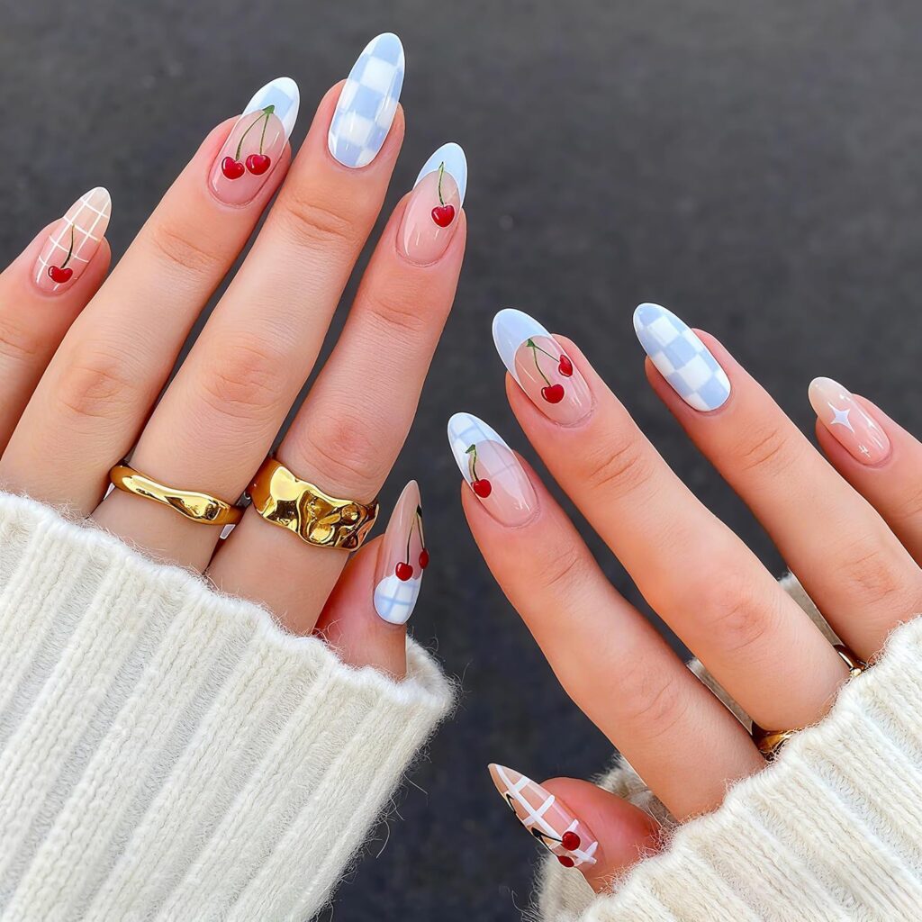 Nude Blue Cherry Nails are a chic, understated design blending soft nude tones with subtle blue and cherry accents. This manicure exudes elegance while introducing playful color details for a modern twist. The contrast of muted base tones and vibrant accents creates a balanced, polished aesthetic. Ideal for minimalists who appreciate refined creativity, this design highlights the beauty of subtle artistry. The combination of soft shades with delicate pops of color ensures the nails feel fresh, trendy, and versatile. It’s a refined, fashion-forward look perfect for everyday wear or casual events.