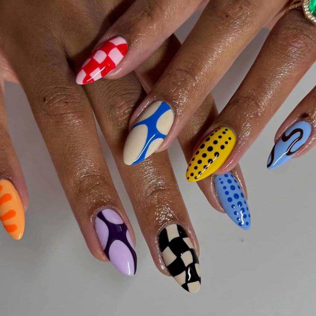 Abstract Swirl & Polka Dot Nails are a contemporary, artistic design that blends playful patterns with a polished finish. Swirls and dots create movement and dimension across each nail, offering a visually intriguing yet sophisticated look. This manicure is perfect for those who enjoy creative expression without sacrificing elegance. The mix of abstract shapes with clean execution ensures a balanced and professional appearance. Ideal for fashion-forward wearers, this design transforms nails into miniature art pieces. The result is modern, chic, and effortlessly stylish, capturing attention with subtle creativity.