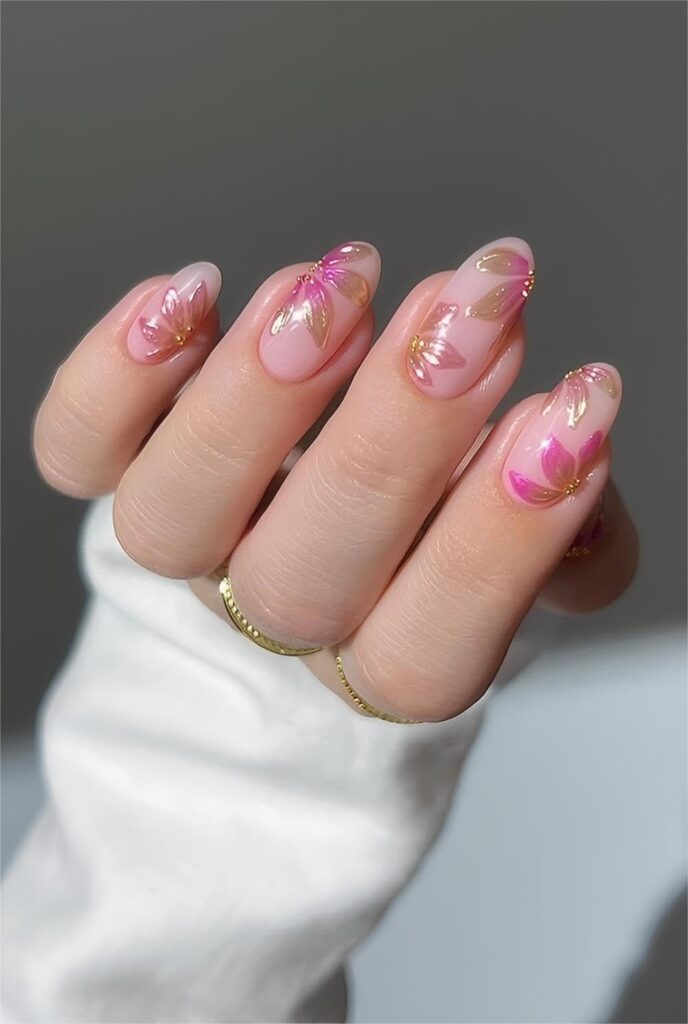Pink Flowers Nails are soft, romantic, and effortlessly feminine, combining gentle pink hues with delicate floral accents. This design creates a polished, elegant aesthetic while highlighting meticulous detail work. Perfect for spring or special occasions, the floral motifs add charm and sophistication to each nail. The balance of color and pattern ensures a cohesive and refined look without appearing busy. These nails evoke a timeless beauty, making them ideal for those who love classic yet fashion-forward manicures. The pink tones enhance the overall elegance and playful femininity of the design.