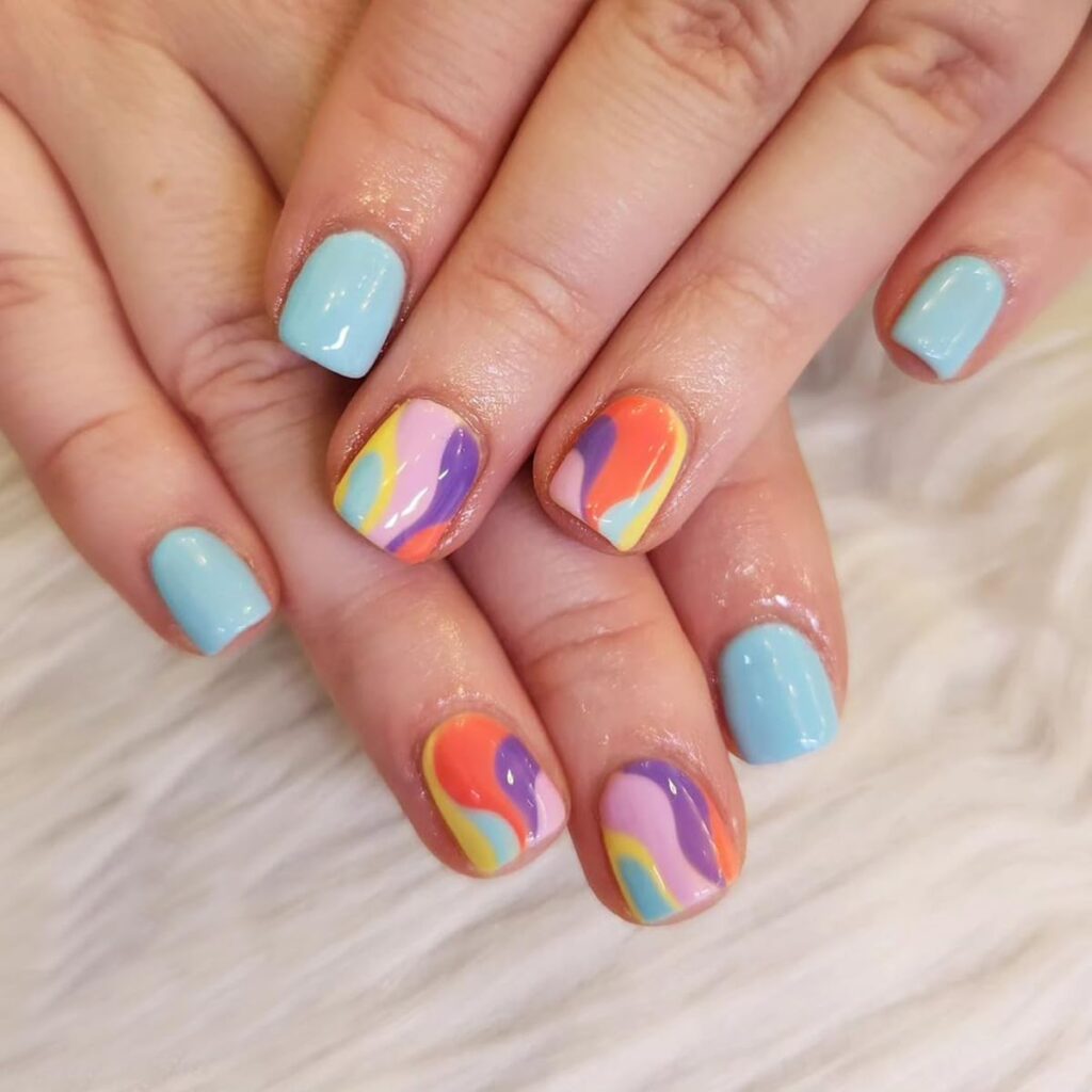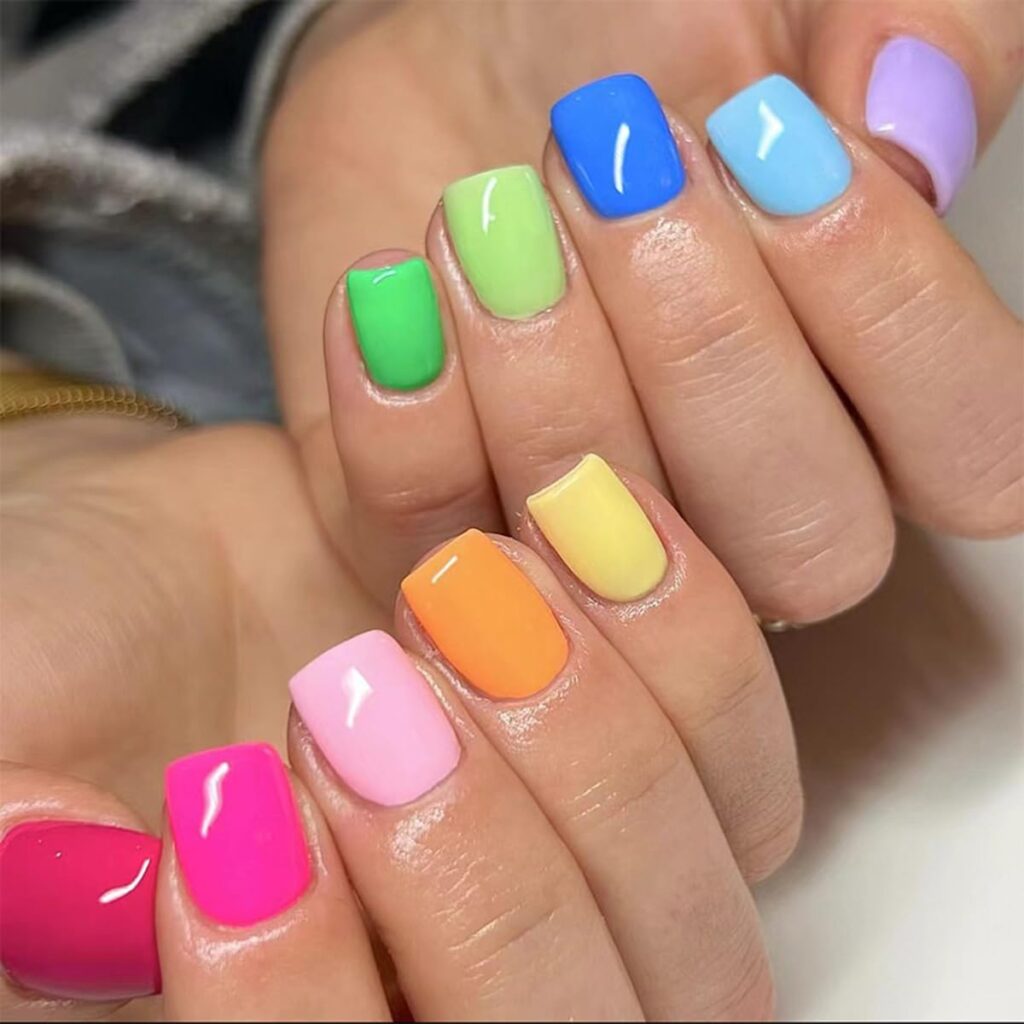 Colorful nails celebrate creativity and playful expression with a polished finish. The mix of shades creates a lively yet cohesive look. This design feels joyful while staying fashion-forward. It’s ideal for those who love vibrant styles done tastefully. The overall vibe remains balanced, modern, and fresh. A fun manicure that still feels put-together and stylish.