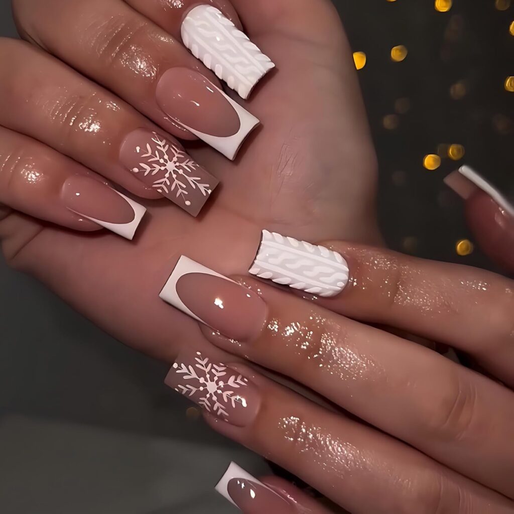 Snowflake design nails bring a delicate, detailed aesthetic that feels crisp and elegant. The design adds visual interest while remaining light and refined. This manicure feels calm, balanced, and thoughtfully styled. It’s perfect for those who love intricate yet subtle nail art. The overall vibe is graceful and polished. A timeless look with gentle charm.