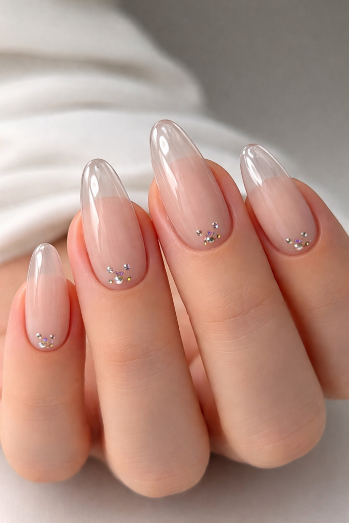 Clear Acrylic Nails with Tiny Gems are the perfect balance of simplicity and glamour. The transparent base keeps the manicure minimalistic, while delicate gem accents add subtle sparkle. Perfect for everyday wear or special occasions, this design is refined yet playful. Each nail appears elegant and polished, showcasing a modern, chic style. These nails are ideal for anyone who loves understated luxury with a hint of glamour.