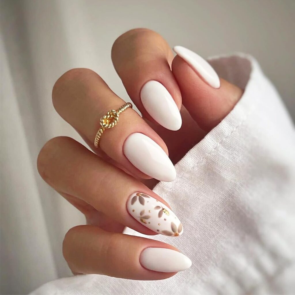 Short almond white heart nails embrace simplicity with a romantic accent. The white base creates a clean, minimal canvas, while the heart detail adds a subtle touch of charm. The almond shape softens the overall look and enhances elegance. This design feels gentle, modern, and easy to wear. It works beautifully for everyday styling or special moments. The overall vibe is sweet, polished, and effortlessly graceful.