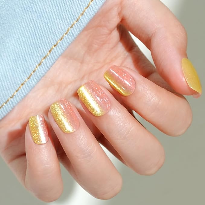 These two-color ombre cat eye press-on nails deliver a striking yet smooth transition of tones. The cat eye effect enhances dimension, giving the nails a dynamic and fashionable edge. The ombre blend feels seamless and thoughtfully styled. This design stands out while remaining elegant and composed. Ideal for those who appreciate artistic nail details with a polished finish. The overall aesthetic is modern, stylish, and refined.