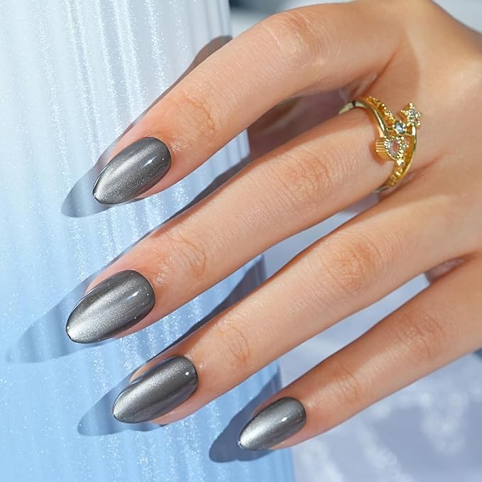 These short cat eye press-on nails deliver subtle drama through a sleek light-reflective finish. The cat eye effect adds depth while the short length ensures comfort and wearability. This design feels modern and refined. Perfect for those who enjoy detail without excess. The look remains professional and fashion-conscious. A stylish option for a polished everyday manicure.