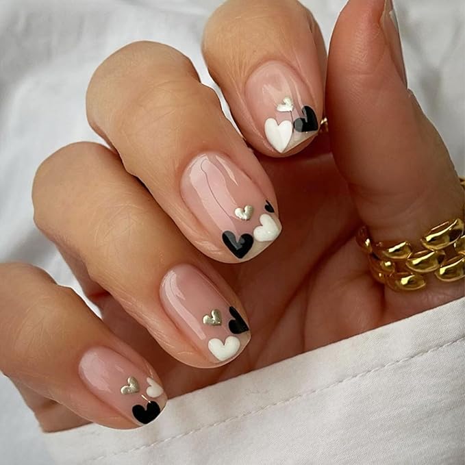Short circle fake nails with black heart designs deliver a modern and slightly edgy vibe. The rounded shape softens the bold heart detailing. Black hearts add contrast while keeping the look refined. The short length ensures everyday wearability. This design feels contemporary and stylish. It’s a unique blend of softness and attitude.