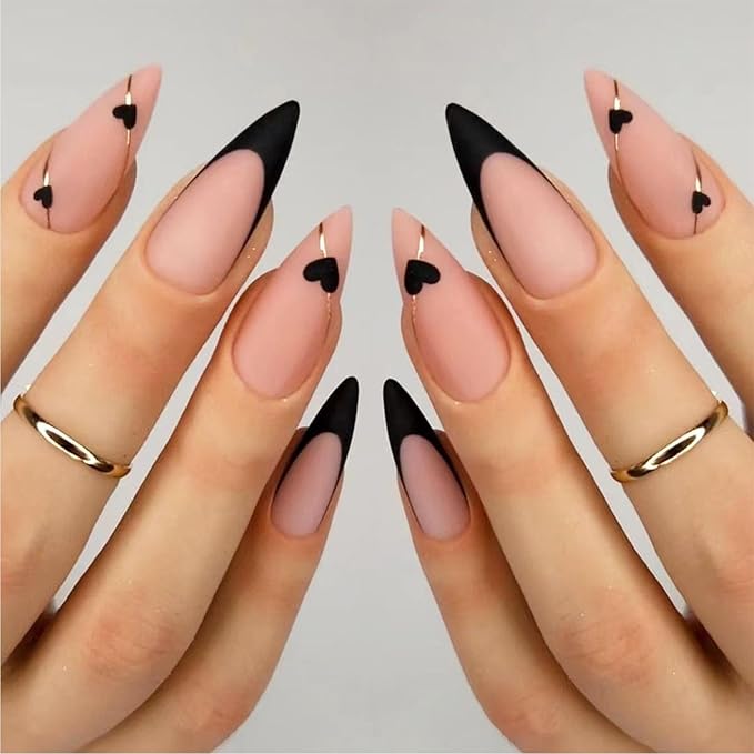 Almond fake nails with black heart French tips present a sophisticated twist on a classic style. The almond shape enhances elegance and flow. Black heart accents add depth and visual interest. The overall vibe feels refined with a modern edge. This design blends tradition and creativity seamlessly. It’s a chic and thoughtful manicure option.