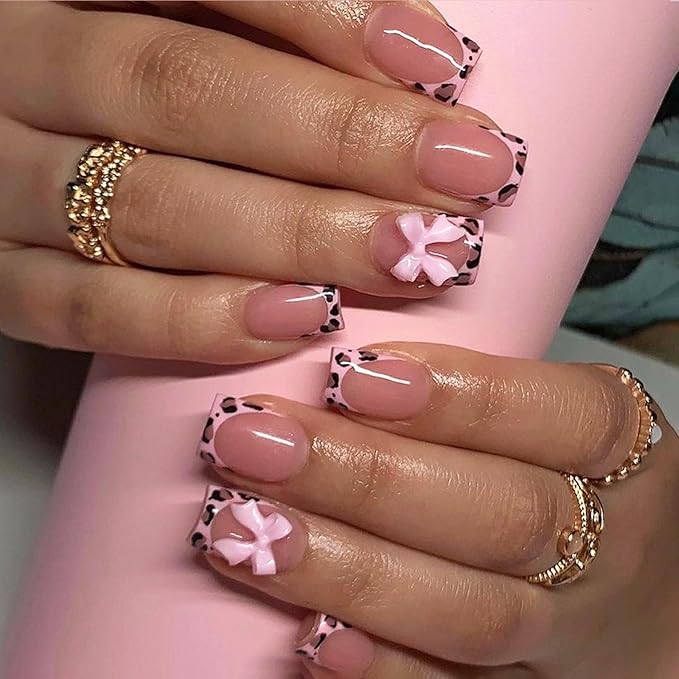 Short square fake nails with heart black spot details offer a subtle yet expressive design. The square shape keeps the look clean and contemporary. Black heart spots add a modern decorative touch. The short length ensures comfort and practicality. This style feels understated but intentional. It’s ideal for minimal yet stylish nail looks.
