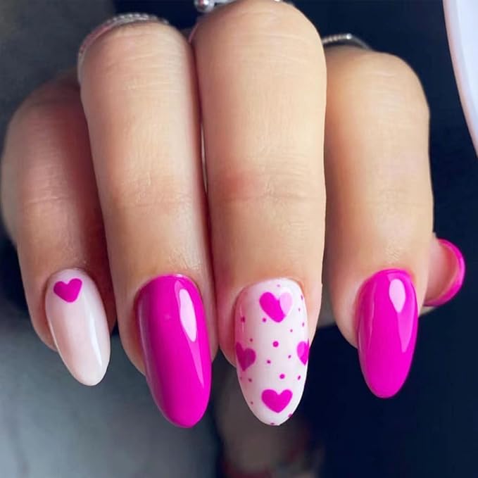 Almond fake nails with heart designs offer a soft, feminine aesthetic with a modern edge. The almond shape lends a graceful flow that complements the romantic detailing. Hearts add charm while maintaining a clean and stylish appearance. The overall vibe feels delicate yet intentional. This design works well for both everyday wear and celebratory looks. It reflects timeless beauty with a fashion-conscious finish.