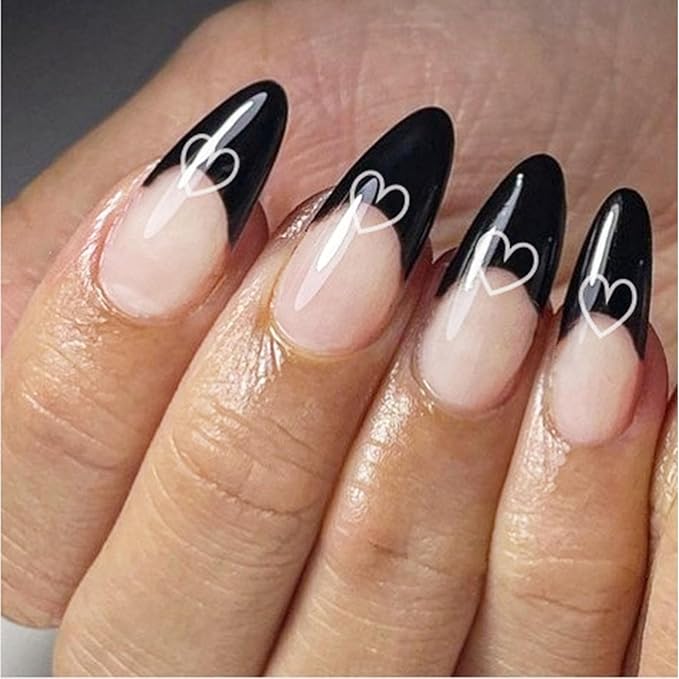 Almond Fake Nails with Black Heart French Tip