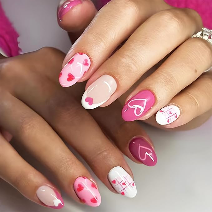 Almond Fake Nails with Heart Designs