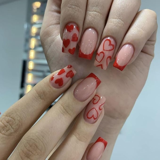 Square fake nails with red heart French tips bring a playful twist to a classic design. The square shape keeps the look structured and modern. Red heart details add a festive, romantic accent. The overall vibe feels fresh yet familiar. This design blends tradition with fashion-forward charm. It’s ideal for those who enjoy subtle statement details.