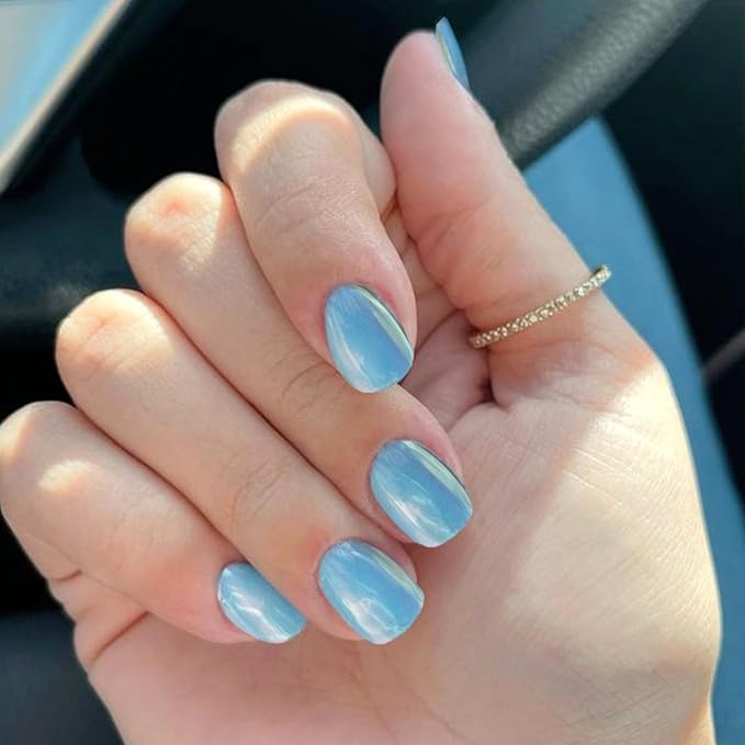 Handmade Sky Blue Chrome Fall Gel Glue on Nails